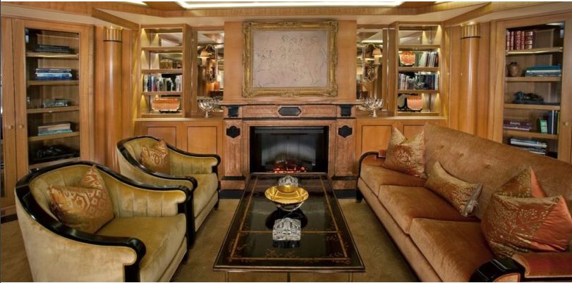 The suite belonging to the owner of the yacht is a wonder in itself. It has a 19th-century English fireplace with statuary marble and a sitting room decorated with sapele joinery, leather chairs, as well as a 19th-century French, Louis XV-style fireplace designed with verde marble.