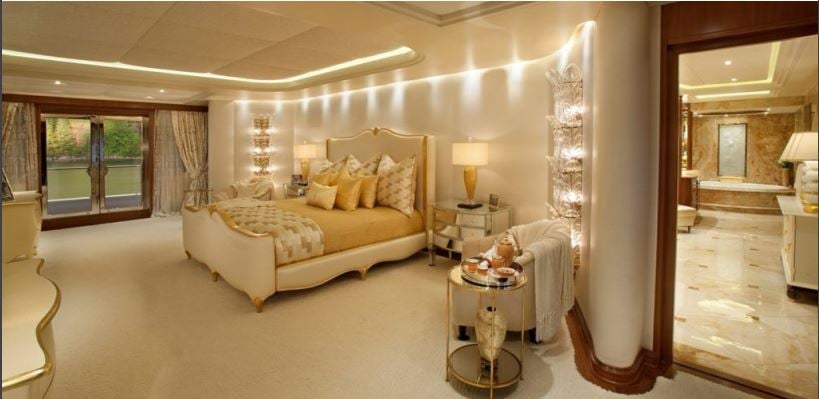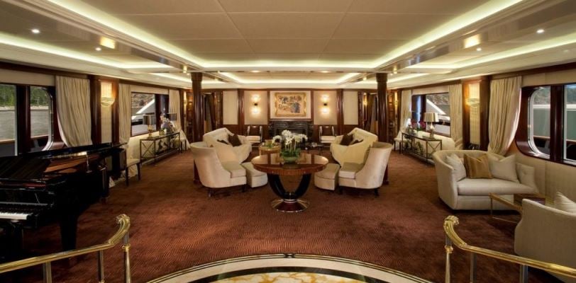 The yacht has nine staterooms that can accommodate up to 18 guests and quarters for 28 crew members. Its bulletproof glass windows and Kevlar reinforcement for the steel hull and aluminium superstructure ensure both security and luxury.