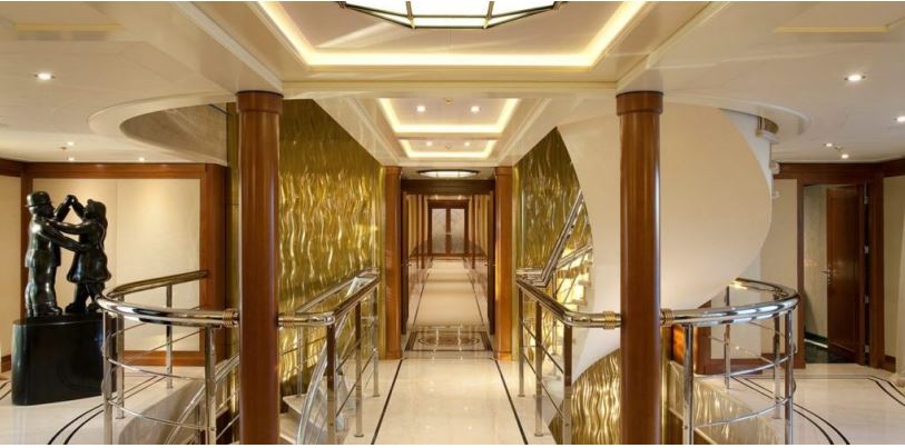 One of the many magnificent features of the Attessa IV is its grand entrance area and incredible central circulation. Another one of its features is its hypnotic staircase that spirals through six decks, split into pairs of semi-circles divided by a fore and aft passageway, creating a landing and foyer at each level.