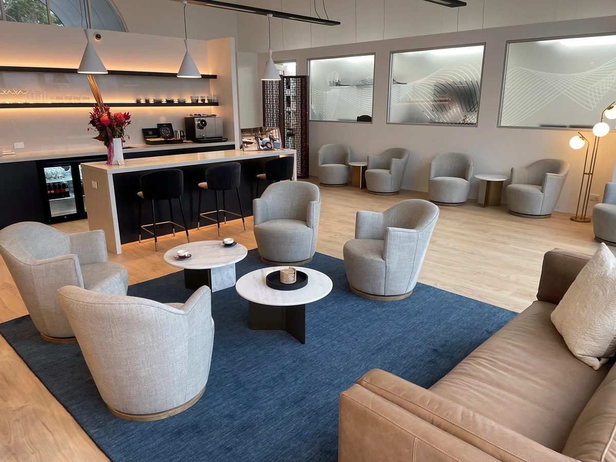 If mass market lounges aren’t your thing, private jet operators ExecuJet have recently had Coco Republic Interior Design in to refurbish the lounge at their Sydney base. “The space now boasts contemporary elements such as muted grey occasional chairs, tan leather sofas, and suede accent stools, all thoughtfully arranged around a central stone bar,” ExecuJet says.