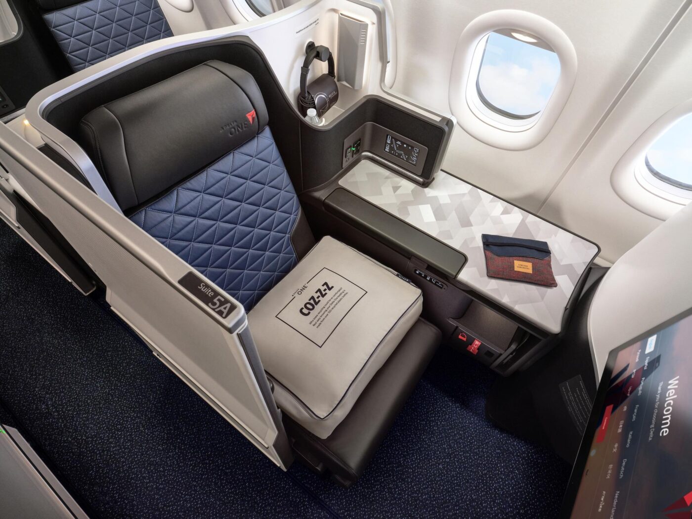 A 32-passenger cabin offering a customized version of the Thompson Aero’s Vantage XL seat, the Delta Suites have a lot going on. Sliding doors? Yep. Westin bedding? Done. Pillows I want to take home? Tick.