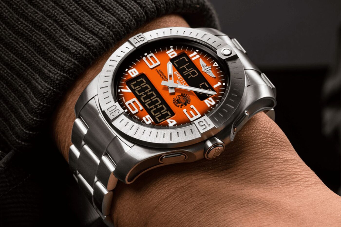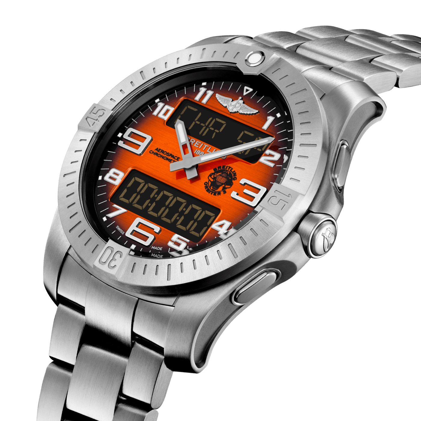 On the dial, the Breitling Aerospace B70 Orbiter boasts a bright-orange dial inspired by the Orbiter 3 capsule, whilst the numerals, indices and hands have each been treated with the Super-LumiNova® for heightened legibility, even at the most daring of heights.
