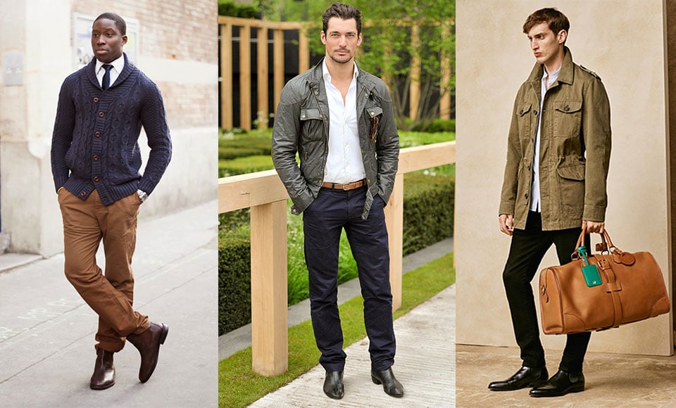 Chelsea boots and jeans are a recipe for a classic, laid-back look. Easy to throw on after work for drinks or dinner, a pair of these boots in a dark brown or black will instantly elevate a pair of indigo jeans and a casual shirt. For the best effect, make sure that the jeans are slim cut (not skinny) as this will allow the top section of the boot to sit comfortably under the hem without getting squashed. Pair this with a white chambray button-down shirt from the likes of Brooks Brothers or Ralph Lauren and a matching belt for an easy but elegant outfit.