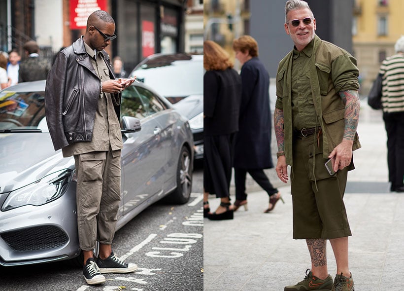 While regular cargo pants are a style sin, there’s a new cargo kid on the block. It’s all about wide leg: a roomier thigh and seat area, and then tapered from the knee down. Compared to regular cargos, look for a pair with pockets that cut cleaner and simpler than traditional utilitarian versions too, less bulk.Stick to three-quarter pants, military pocket pants that are oversized. Darting on the knee gives back the illusion that your knee is bending, which looks cool,” says Tanaya.