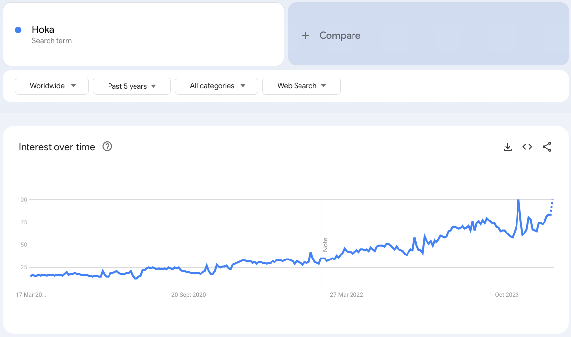 Plus, if we take a look at Hoka’s own status, you’ll find that the brand has enjoyed soaring profits for a number of years — most recently confirmed in their February 2024 results — while search trends show that interest in the brand has exploded over the past few years. In short, it’s a cool, fast-growing brand, and surely no president should be criticised for knowing what his people like…