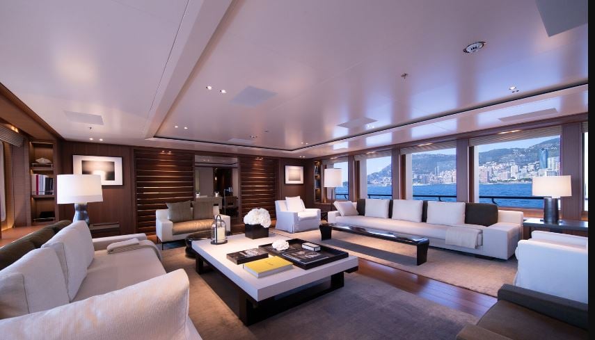 This tri-deck’s beautiful exterior was designed by De Voogt Naval Architects, and the interior design was done by Redman Whiteley Dixon. It is built with a teak deck, steel hull, and an aluminium superstructure. The boat has seven staterooms and can accommodate up to 12 guests. It contains all kinds of amenities, including a gym, a lounge, a Jacuzzi, and a beach club for the guests to relax on the edge of the water.