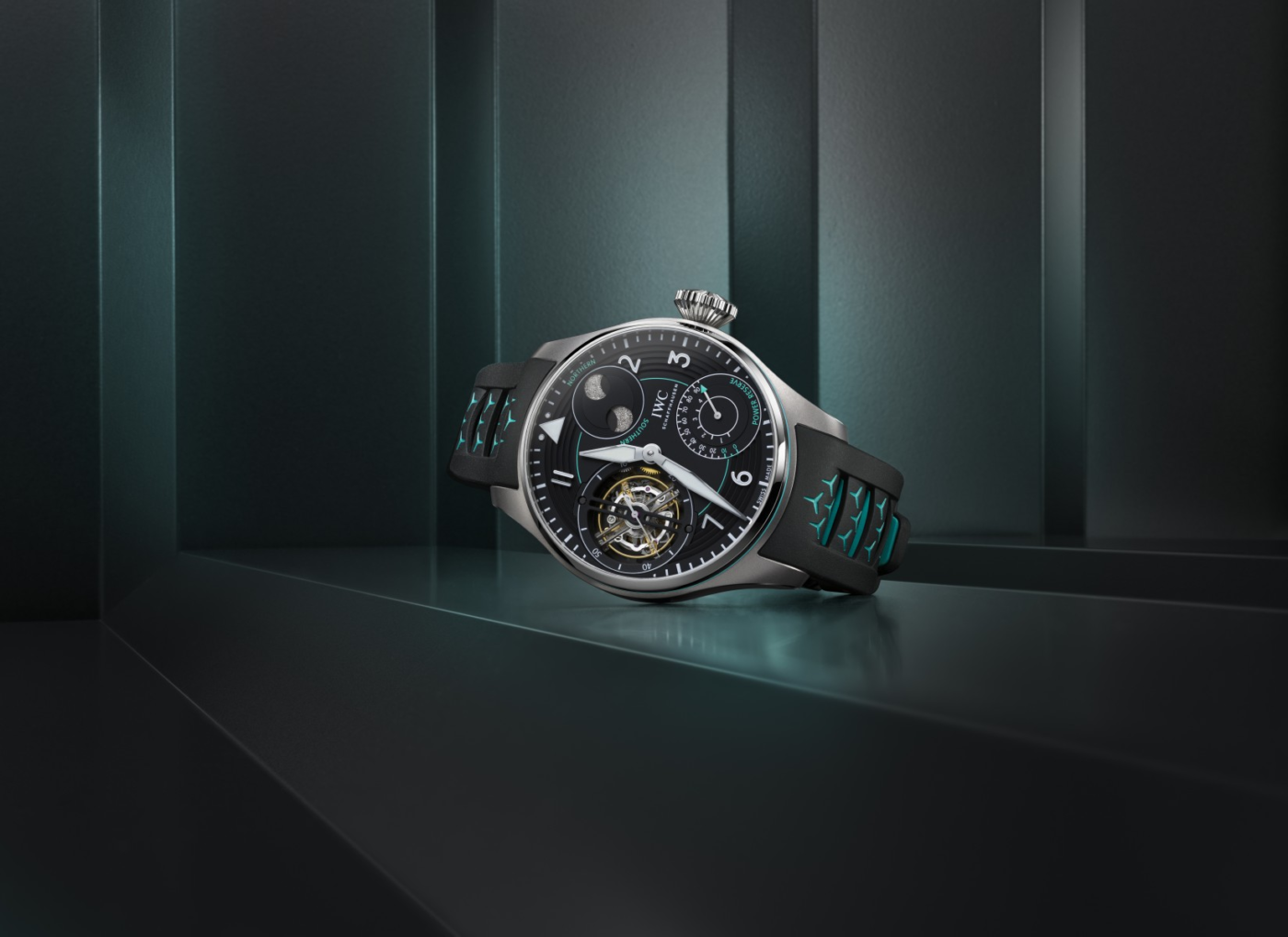 With a constant-force tourbillon at 9 o’clock, a double moon phase display, and a power reserve indicator, the case is inspired by the design language of the AMG ONE and finished with accents in Petronas green, IWC CEO, Christoph Grainger-Herr, explains what makes the piece so special: