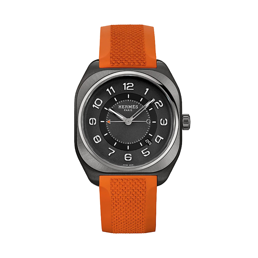 A huge departure from the French brand’s typically restrained, artistic watch offerings and a real contender in the luxury sports watch space, the Hermès H08 features a 39mm cushion-shaped titanium case and the option of either a titanium bracelet or rubber strap, which looks particularly nice in signature Hermès orange.