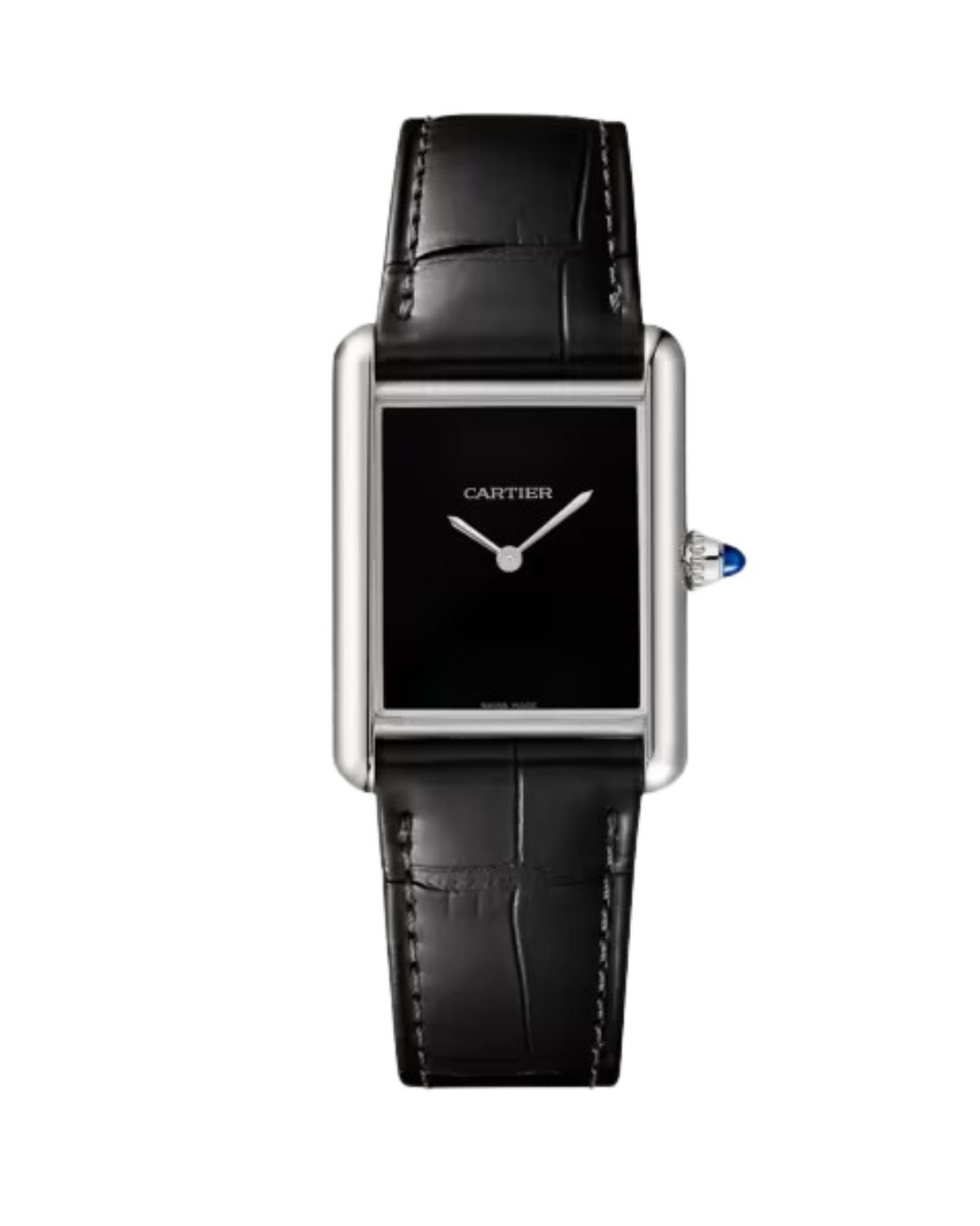 Today’s iteration of the Cartier Tank Must features a classic 33.7 mm rhodium-finished steel case with a deep black lacquered dial that blends Cartier’s rich heritage with modern aesthetics. This piece is powered by a quartz movement for increased accuracy and convenience.