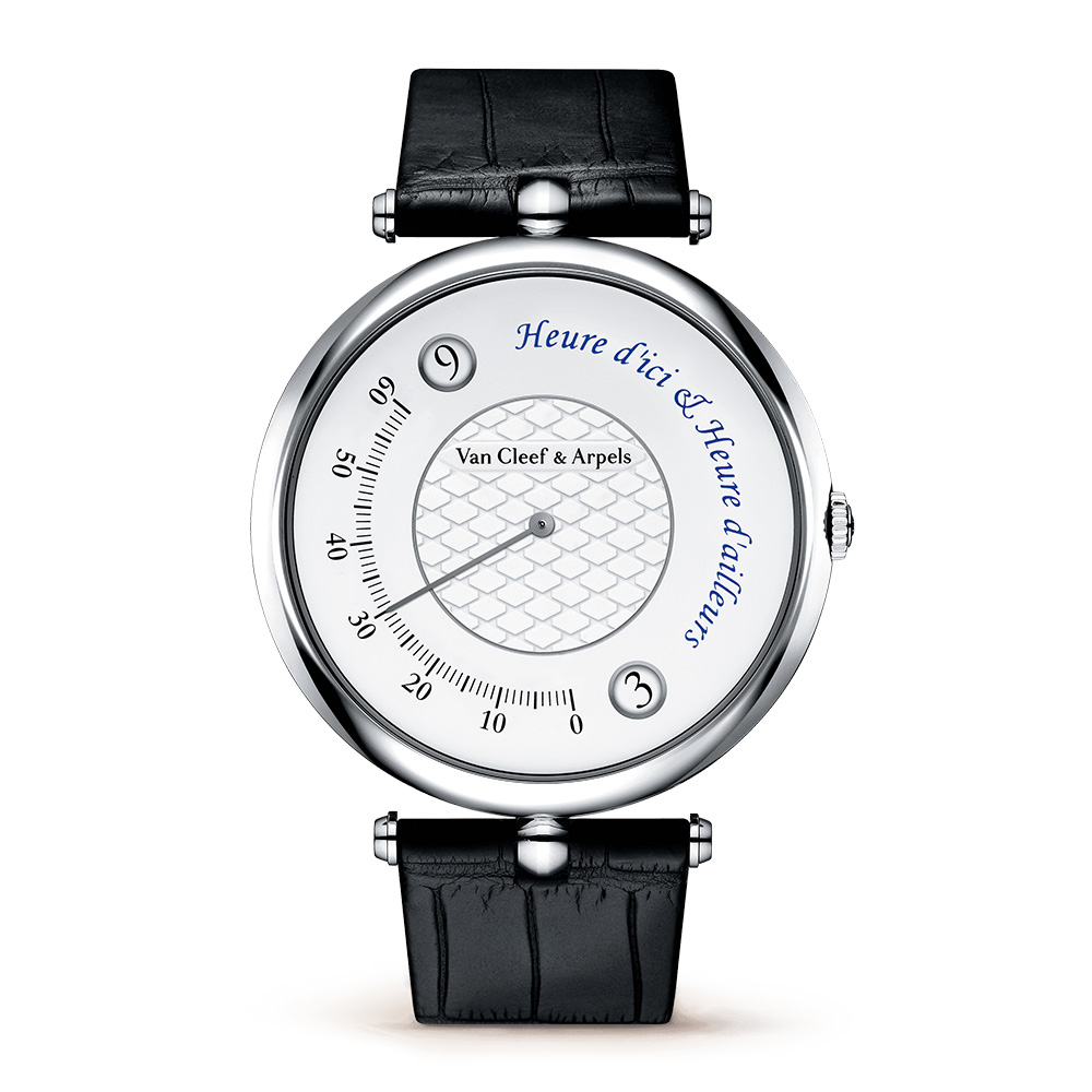Most Pierre Arpels models are simple, time-only affairs, but occasionally it’s a canvas for some more creative affairs, like this Heure d’Ici & Heure d’Ailleurs (which charmingly translates to “Time Here & Time Elsewhere”): a dual time complication with a double jumping digital hour display and retrograde minutes.