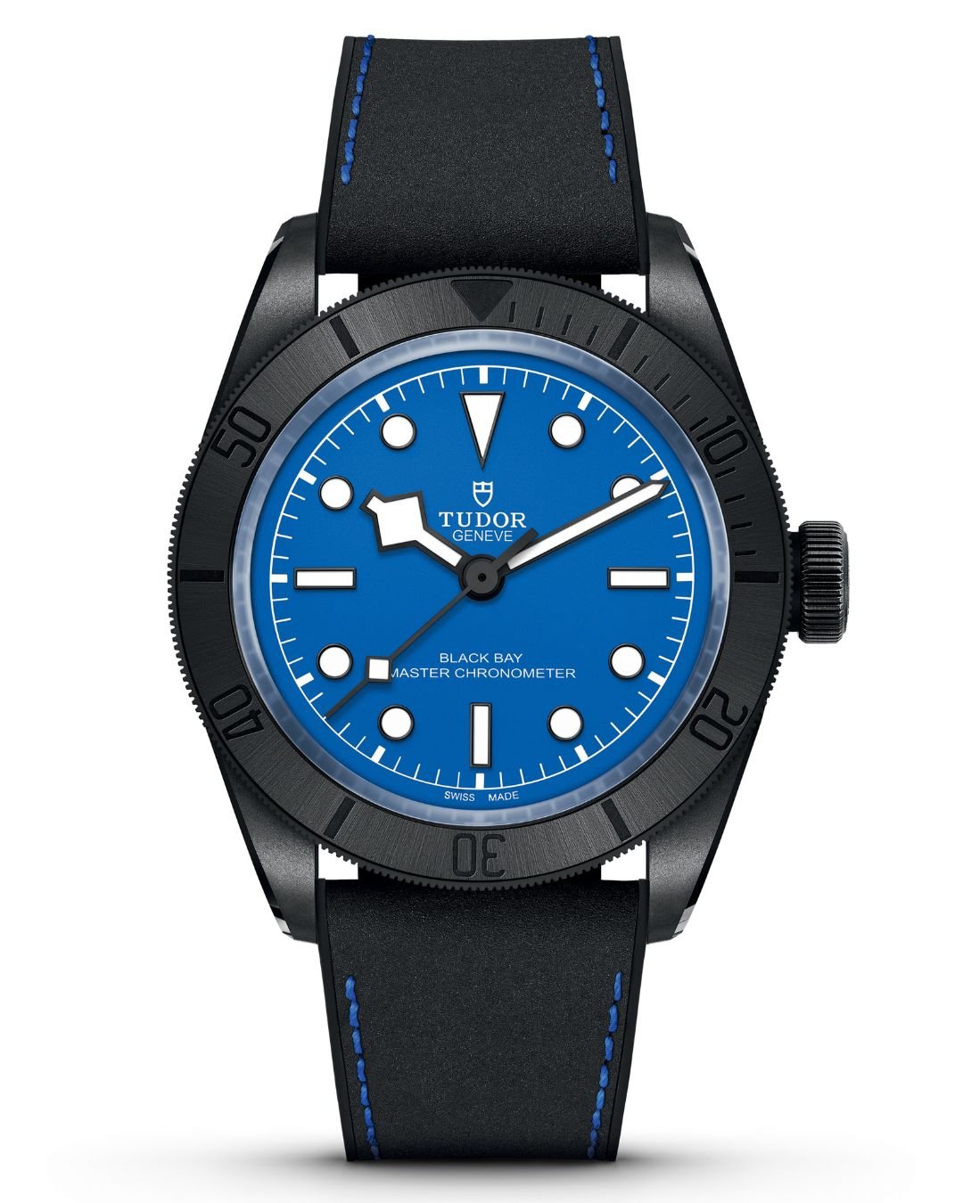 This 41mm matte black ceramic watch features an electric blue domed dial, “Snowflake” hands with Swiss Super-LumiNova®, and the COSC-certified automatic MT5602-1U movement. Available with either a hybrid leather rubber strap or a black fabric strap, it’s an expected sporty offering from Tudor designed for performance and style.