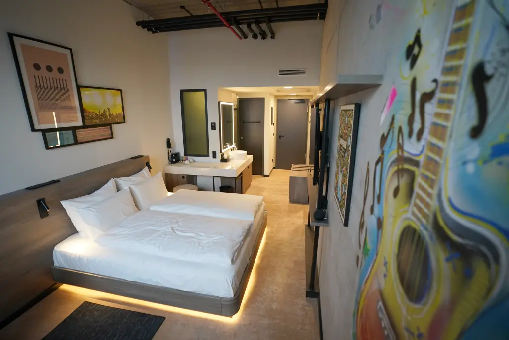 While the vibe being put out by developers is that this is a testament to Germany’s future, the hotel also nods to its past, with a memorialization of its wartime history and stories of the people who built it within only 300 days displayed in a museum exhibition about the process on the first floor.