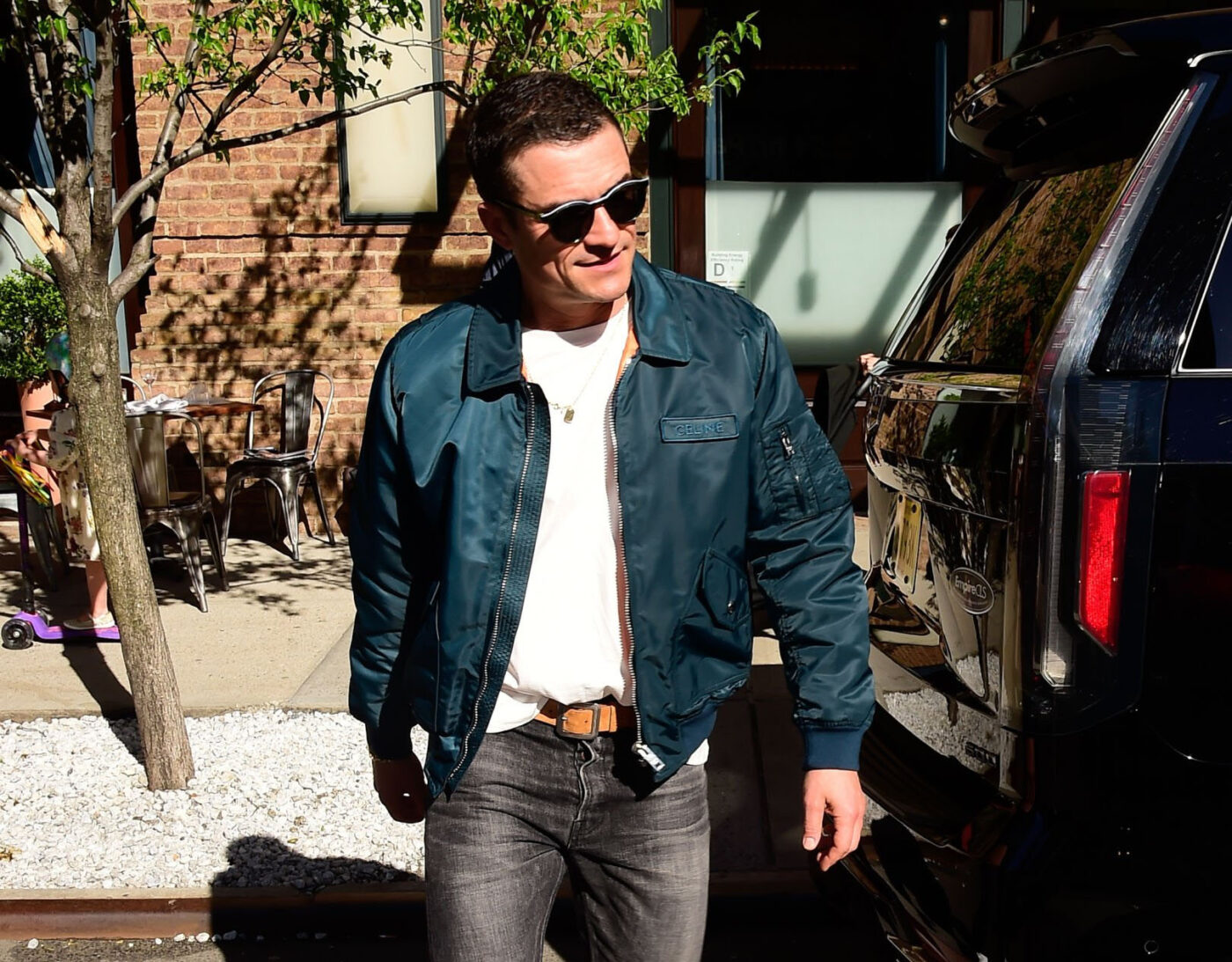 Clad in a sleek Celine blue petrol nylon bomber jacket—the price tag a cool $3,000—Orlando turned a simple dog walk into a runway event. The orange-lined jacket, glossy and refined, played effortlessly against the casual backdrop of faded grey jeans, white t-shirt and crisp white sneakers.