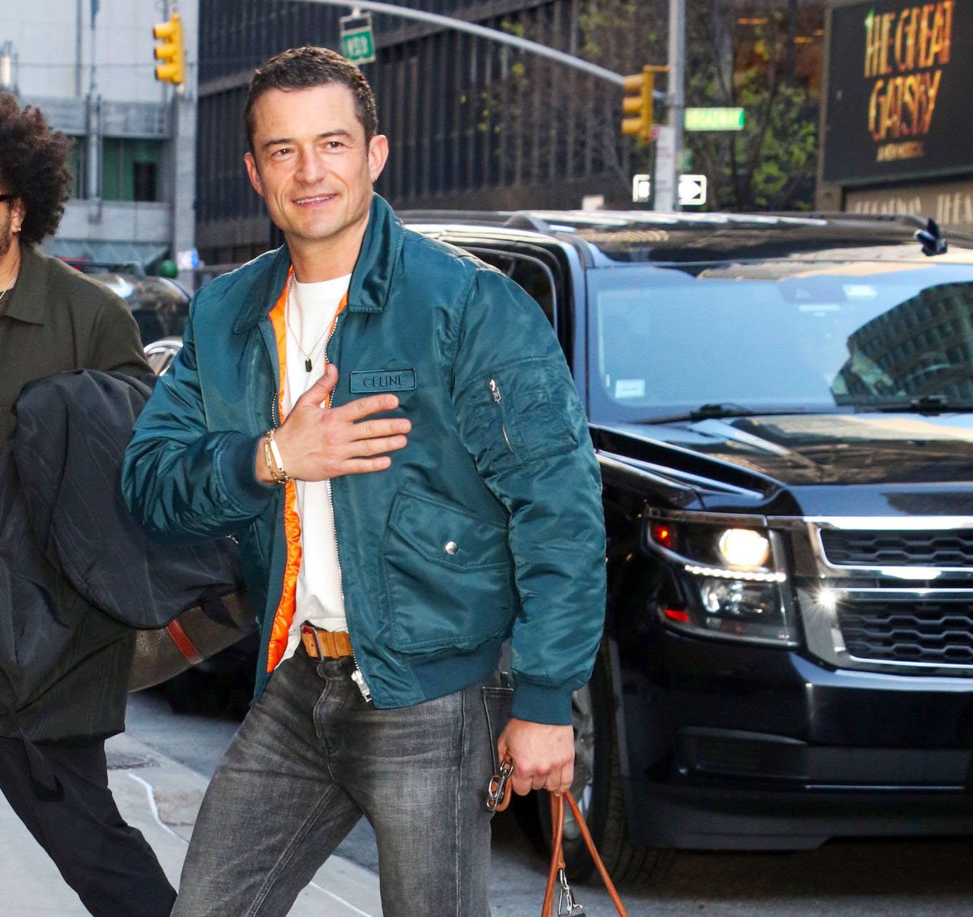 Adding to the vibe, Orlando sported a gold pendant necklace, alongside a matching gold bracelet that peeked out beneath his jacket’s cuff. The look is complimented with a pair of dark plastic framed sunglasses, to keep the sun and paparazzi at bay.