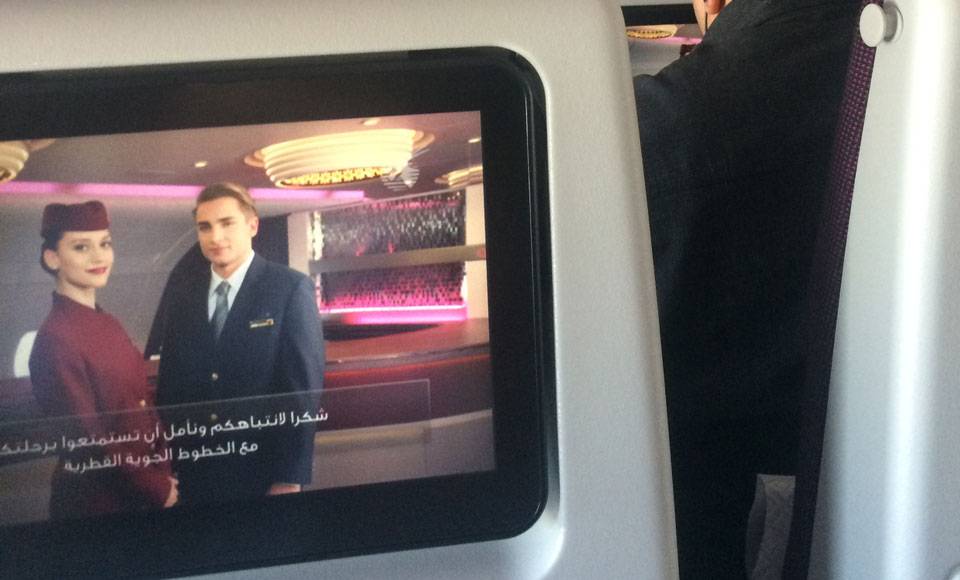 Forget the Koran: after flying to Europe a couple of times I can now recite the generic “Airline Safety Spiel” in Arabic, French, Spanish, English and Mandarin, word for word. Although this is not exclusive to Qatar (every airline is legally obliged to do this), just when I thought I’d got away with one, on the Doha-Madrid leg, where I had scored the exit row, the flight attendants pulled the TV out of my armrest for me and plonked it in front of my face, 1984 style.