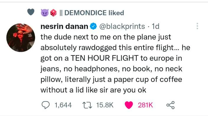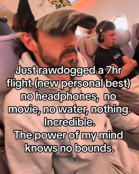 “The dude next to me on the plane just absolutely raw-dogged this entire flight…. he got on a TEN-HOUR FLIGHT to Europe in jeans; no headphones, no book, no neck pillow, literally just a paper cup of coffee without a lid. Like, sir, are you okay?”