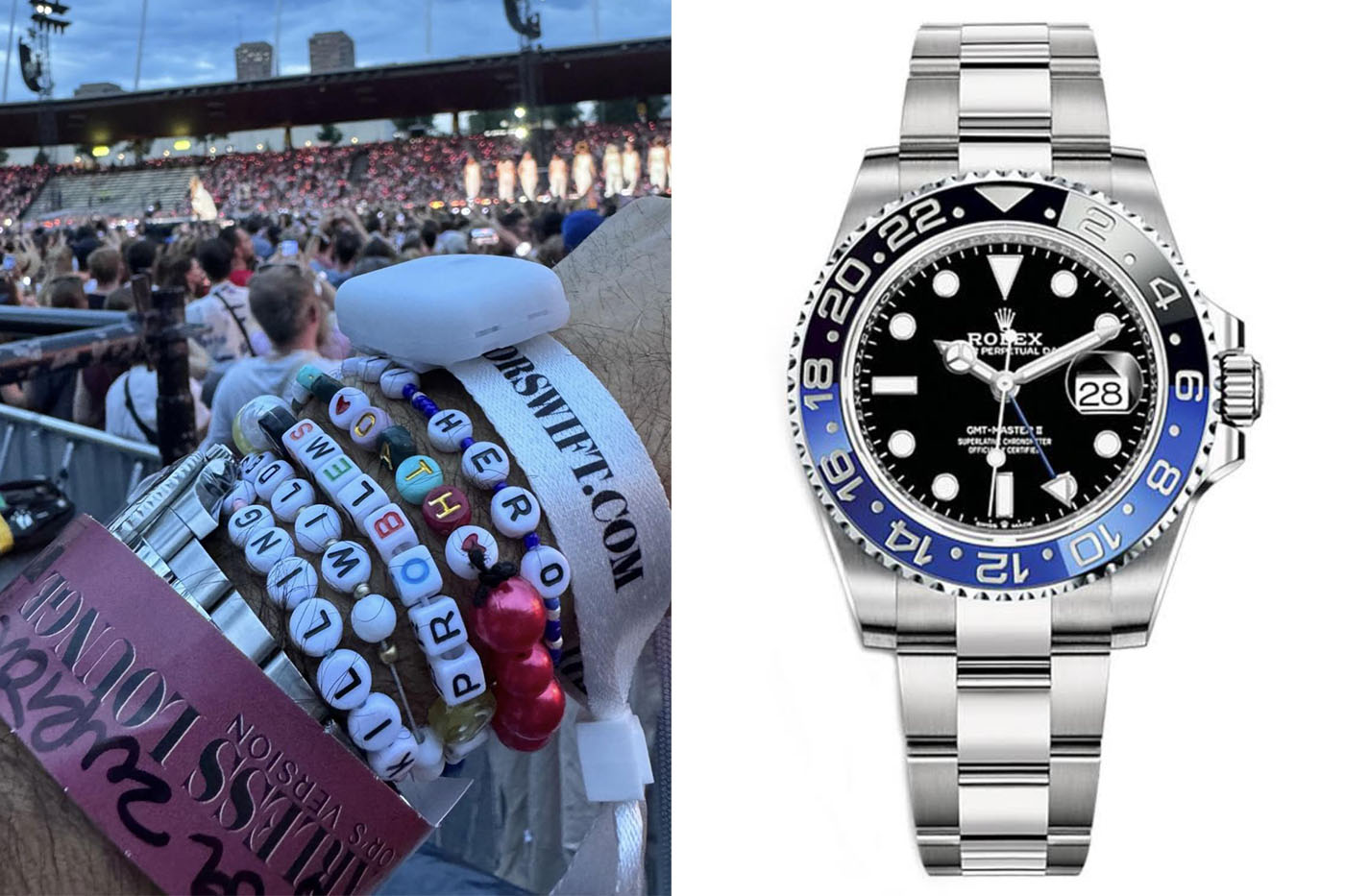 Federer made the spontaneous trip and shared moments from the concert on social media, including a photo of his wrist with friendship bracelets and, poking out amongst the Taylor Swift paraphernalia, the unmistakable fluted bezel of an iconic Rolex release, the Rolex GMT Batman with two-tone rotatable fluted bezel.