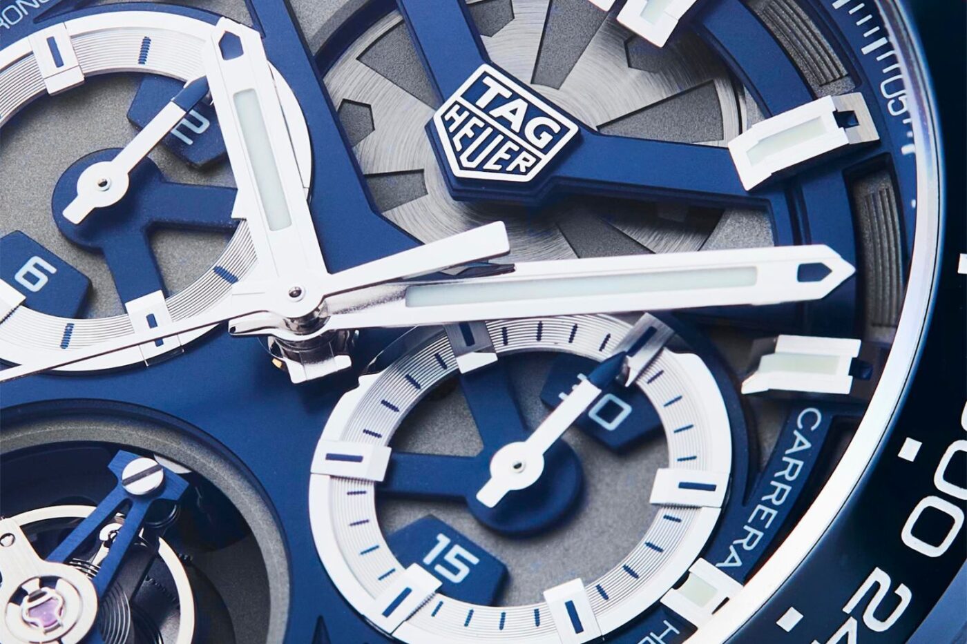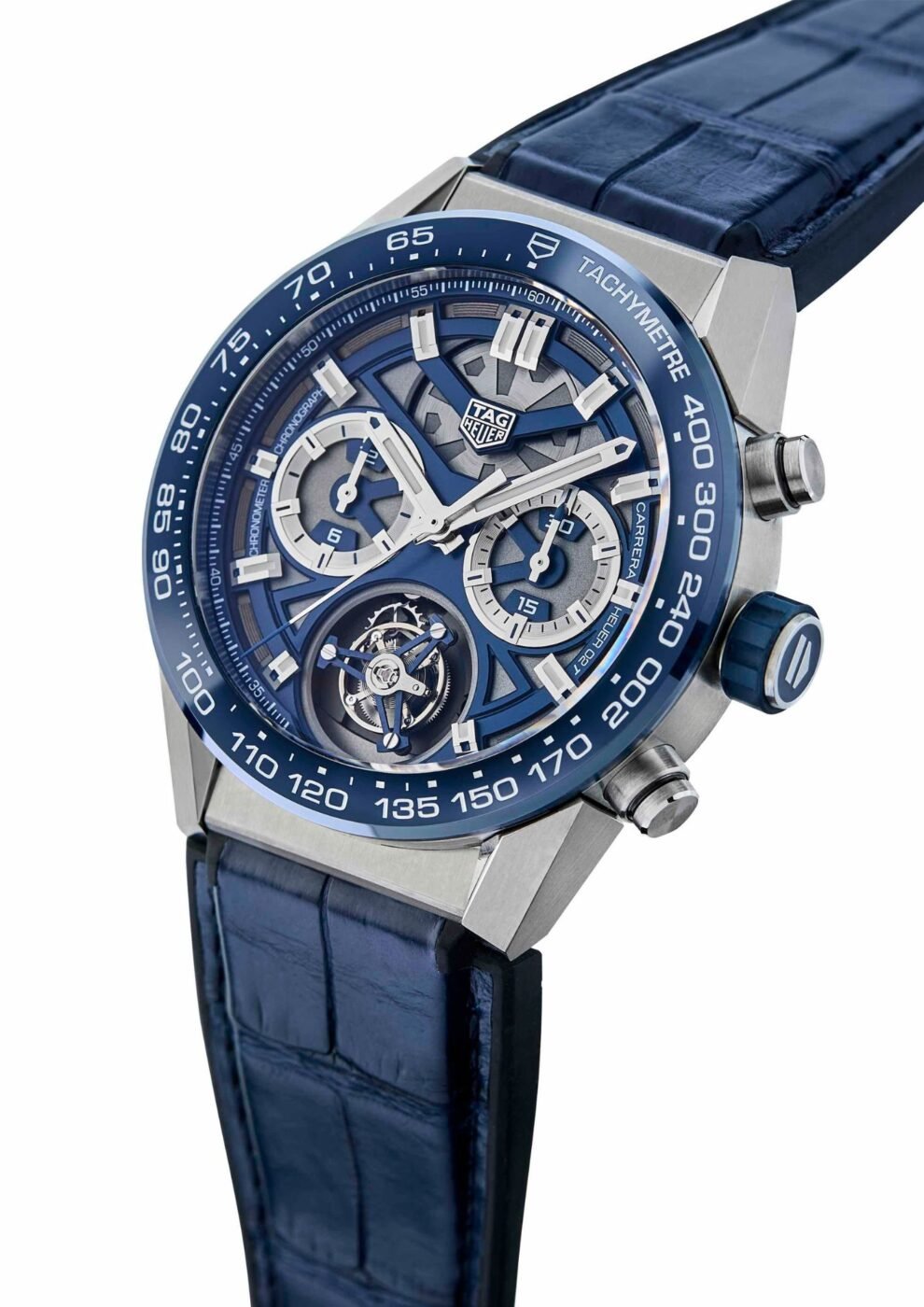 At the 6, the flying tourbillon, to which this rare piece owes its name, sits neatly as the beating heart of this unique iteration. On the reverse side, the sapphire caseback reveals the watch’s famed Calibre Heuer 02 Tourbillon, a COSC-certified movement with a blue column wheel and a carbon tourbillon carriage, delivering a formidable power reserve of 65 hours.