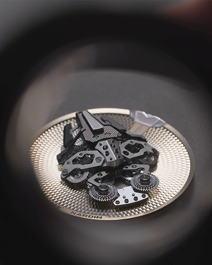 Behind the carousel movement, is the highlight of the Freak: a diamond guilloché pattern finished in sand-coloured CVD, reminiscent of sand dunes. Each piece is handcrafted by a skilled artisan using a traditional 18th-century rose engine – no electronics or laser guidance.